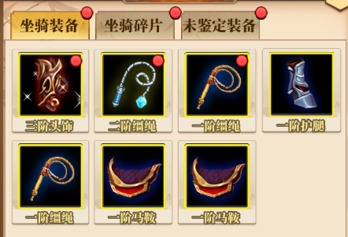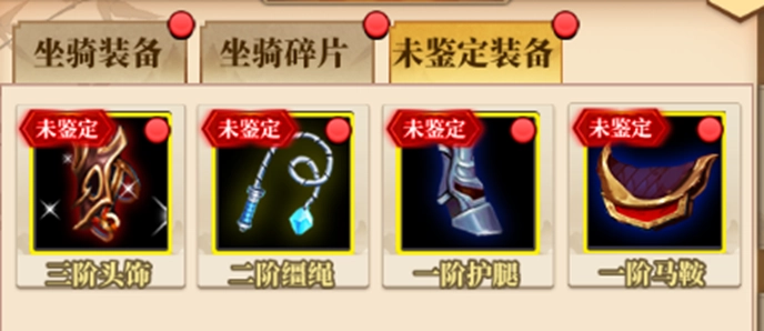 坐骑装备通过对未鉴定装备进行鉴定获取,特定阶数与部位的未鉴定装备,仅能鉴定出阶数和部位与之对应的坐骑装备。