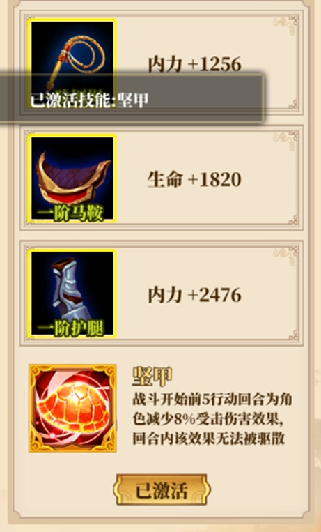 坐骑解锁后,可点击界面下方的技能图标查看坐骑技能列表。