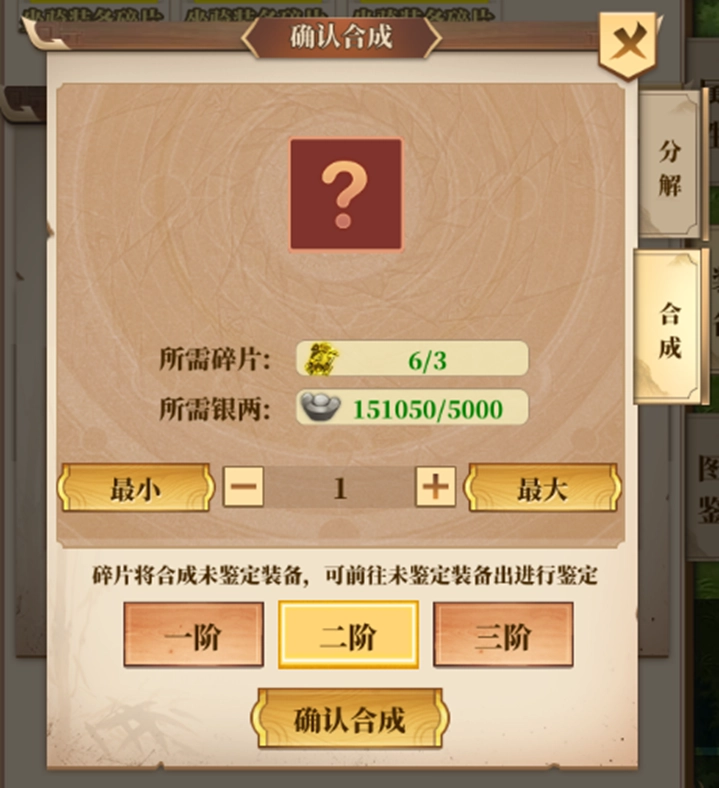 每3个坐骑装备碎片能合成1个未鉴定装备,合成出的未鉴定装备部位是随机的。而且,特定阶数的装备碎片仅能用来合成对应阶数的未鉴定装备。