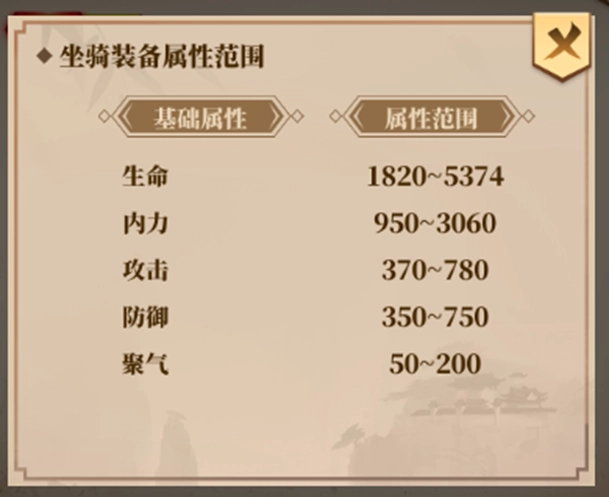 坐骑属性目前设有格挡、暴击伤害、连击伤害、暴击免伤、连击免伤、聚气这6个通用属性。不同坐骑具备的属性类型数量存在差异,玩家能够消耗特定升级道具【五行露滴】(*可在商城与武道阁商店中购买),对每只坐骑的各个属性展开升级操作。属性升级后会得到提升,并且会直接作用于玩家自身的角色。
