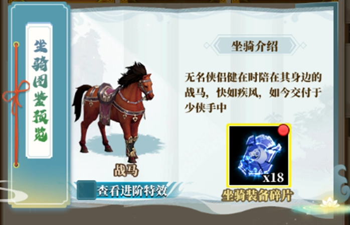 坐骑解锁后,可通过消耗一个相同的坐骑道具来对其进行进阶操作。