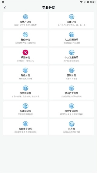 具体的使用可依据自身需求灵活选择,像“专业分院”就涵盖了房地产、党建分院、管理分院、人力资源分院、个人发展分院、财经分院、供应链分院、互联网、营销等职业教育板块,每个分院都配备了对应的专业课程与知识解答服务。