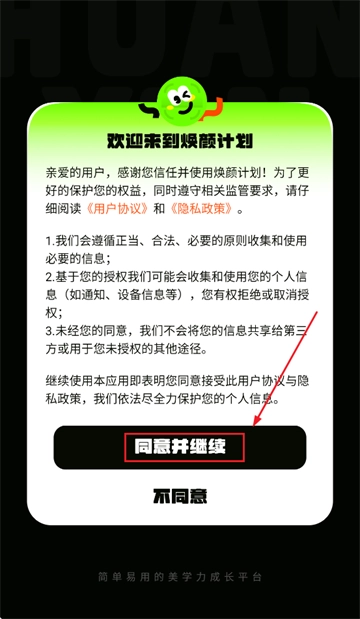 开启焕颜计划,于“欢迎来到焕颜计划”提示界面点击同意并继续。