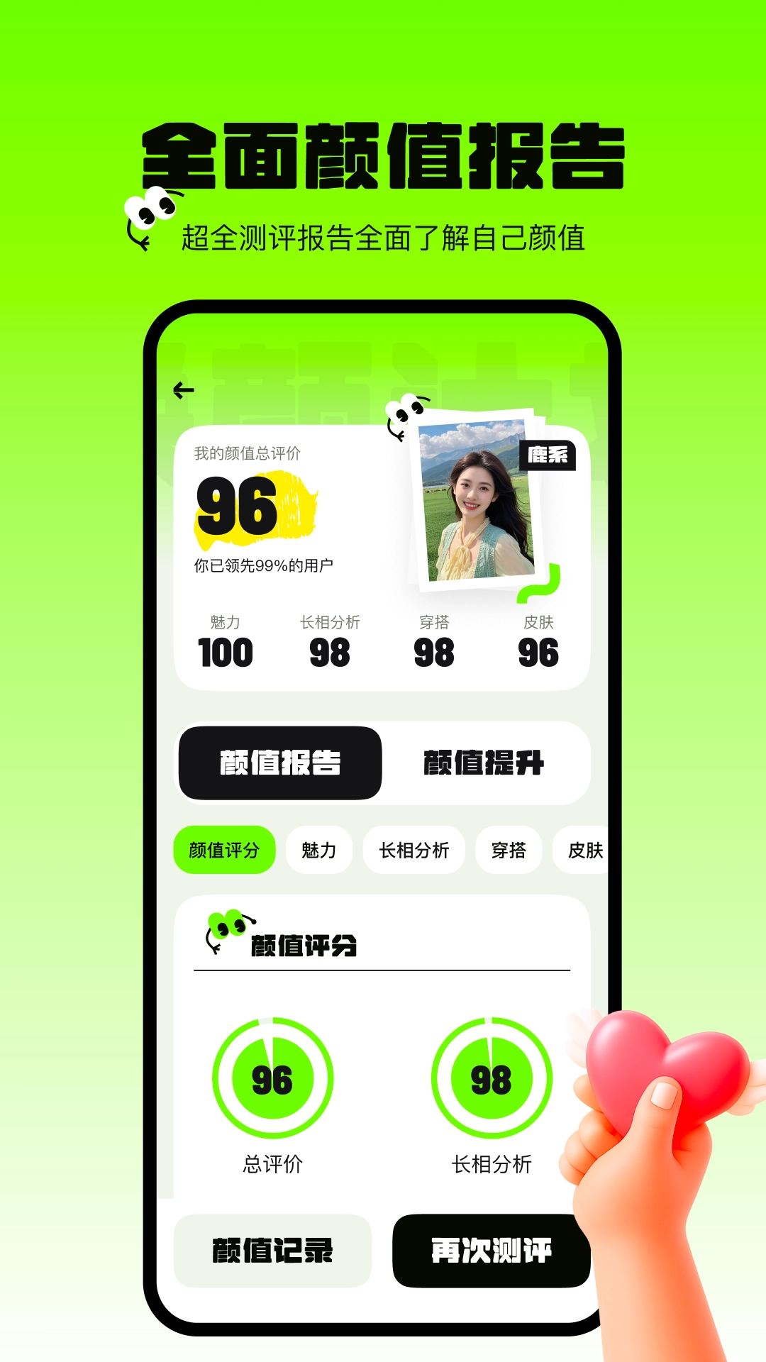 颜值评估:上传照片,瞬间得到精确颜值分数。深度剖析脸型、五官比例以及面部对称性,不再盲目猜测,用数据来证明!
