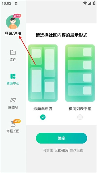 2. 在社区内容展示形式的选择页面,点击“登录注册”,即可进入登录账号页面。
