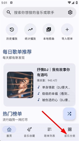 1、在音乐软件首页,点击底部的音乐分类,进入音乐分类页面。