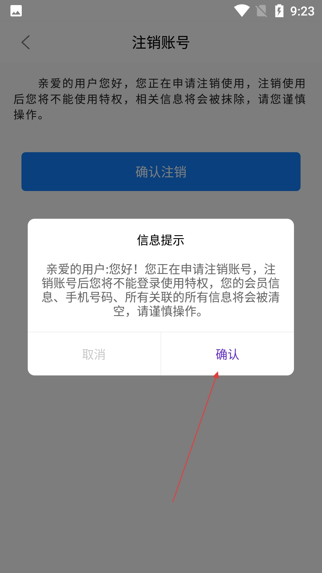 4、在信息提示框中,点击【确认】,即可完成账号注销操作。