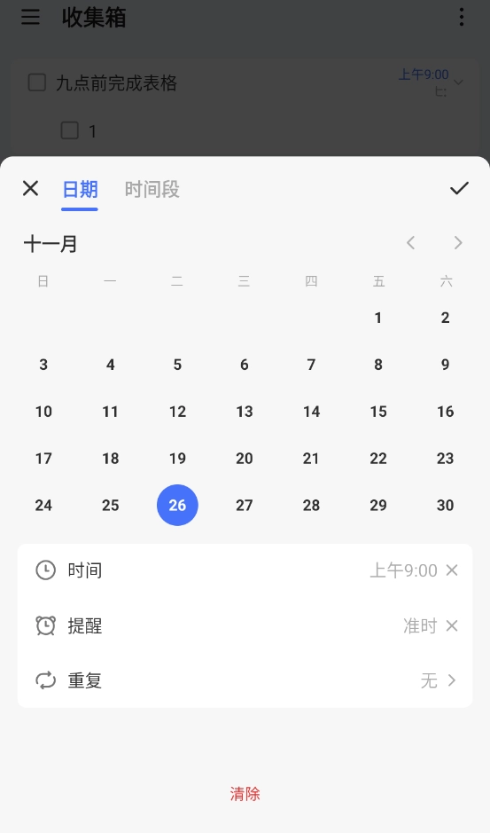 回到任务编辑界面,点击蓝色日期区域,就能重新设置任务的日期、时间、提醒方式,以及是否需要重复提醒。