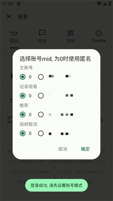 登录后选择账号mid并点击确定;若不选择,当值为0时则使用匿名账号。