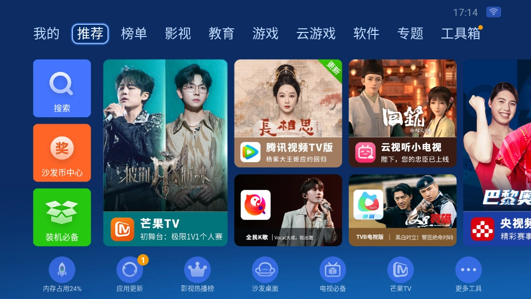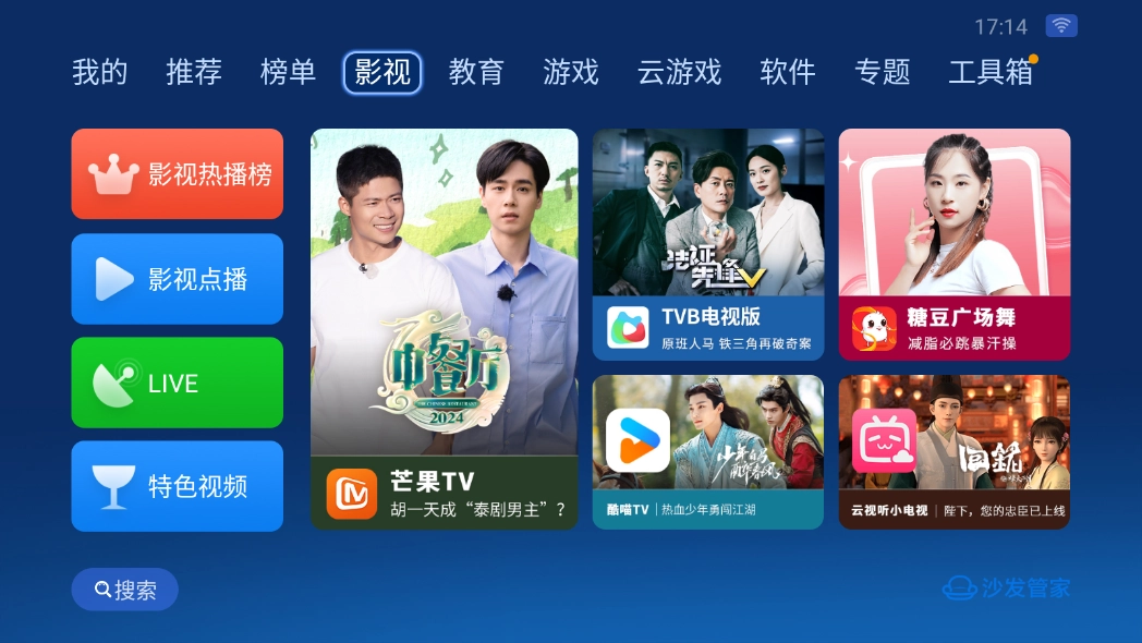 沙发管家是一款基于安卓系统开发的智能电视应用,它整合了丰富多样的电视软件资源,涵盖影视、音乐、学习等多个类别。有了它,用户无需再为找不到适配智能电视或电视盒的应用而发愁。平台内的电视应用十分全面,并且全部免费提供使用,同时还兼容小米电视、乐视、创维、酷开、TCL、康佳、海信、海尔、长虹、联想等众多品牌的安卓智能电视。
