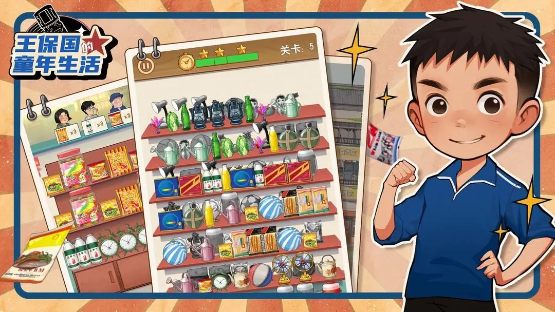 王保国的童年生活游戏是一款卡通风格的休闲模拟经营游戏,玩家将化身王保国,和家人共同经营一家小卖部。在游戏里,玩家需要采购各类商品进行售卖,赚取利润后就能升级店铺,要是资金充足还能开设分店。