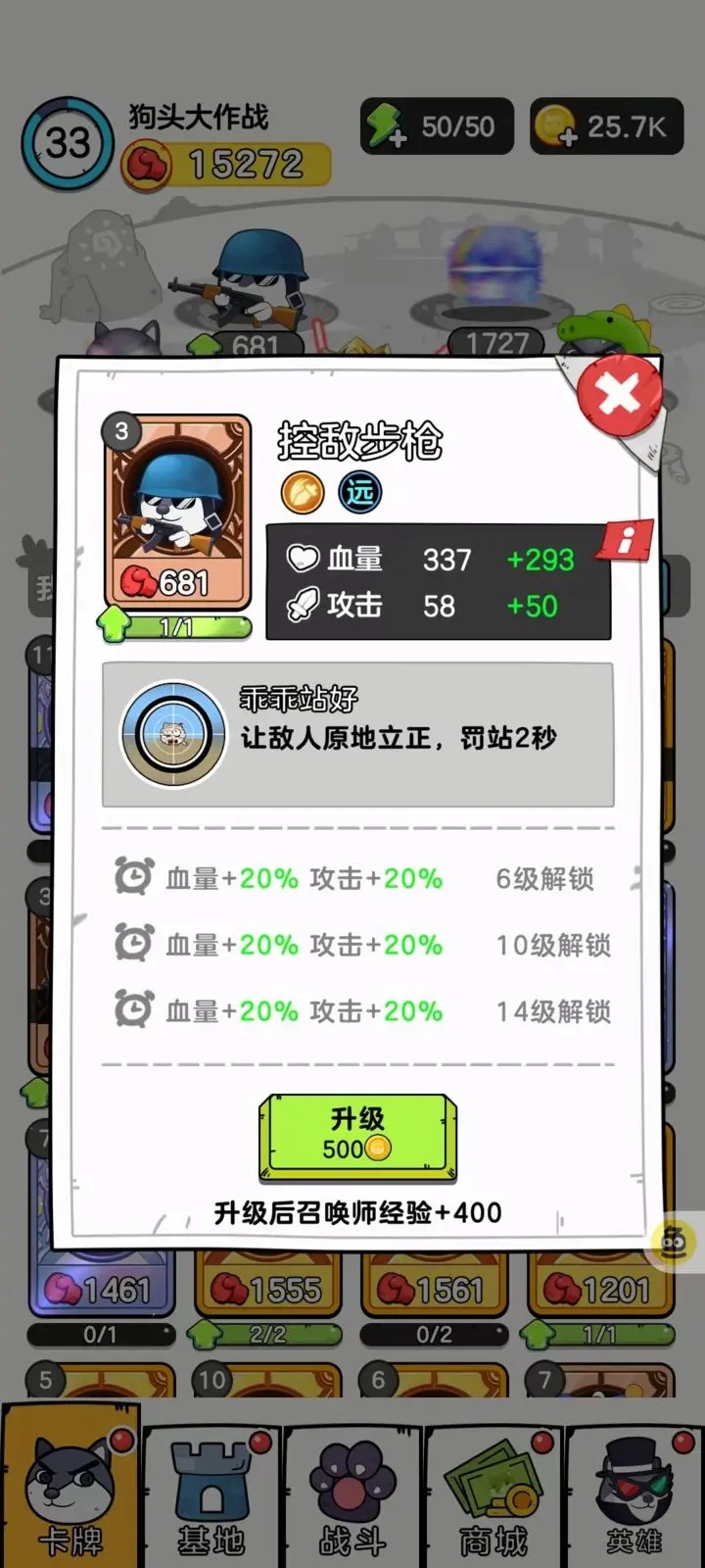 然后咱们来说说,“控敌步枪”的血量和攻击吧,攻击算的上是中规中矩,血量也很一般,可以搭配前排强力狗头来使用,以保证最大化输出,每次升级狗头也会有不同程度的加强~还有被动技能-乖乖站好:让敌人原地立正,罚站2秒,等级提升后的被动技能也会提升技能伤害,这个被动技能加强了战斗实力,运用在实战中~