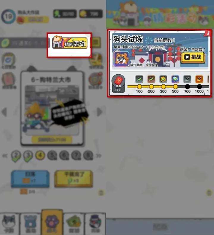 游戏内的任务分为主线任务、支线任务和日常任务。主线任务引导玩家逐步了解游戏世界观与核心玩法,从新手教程开始,随着玩家的游戏进度推进,解锁新的游戏内容,如狗头种类、战斗场景等。支线任务通常围绕特定狗头或游戏剧情展开,为玩家提供额外的游戏体验与奖励。日常任务则是每天都会刷新,内容包括收集一定数量的资源、完成指定次数的战斗等,完成后可获得丰富的奖励,如游戏货币、经验道具、稀有狗头碎片等。活动方面,官方会不定期举办各种限时活动,如节日活动、主题挑战活动等,活动内容丰富多样,可能要求玩家在特定条件下完成战斗,或收集特定道具等,完成活动目标可获得珍稀的狗头、强力道具等丰厚奖励。