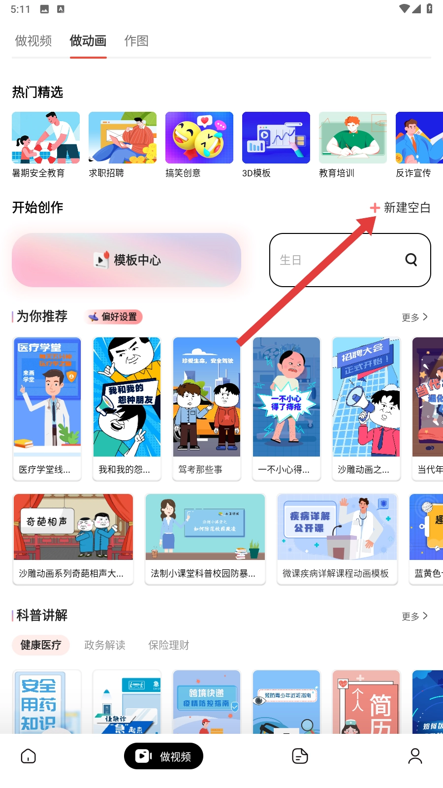 在制作动画界面时,点击【新建空白】按钮,就能创建一个全新的创作项目啦。