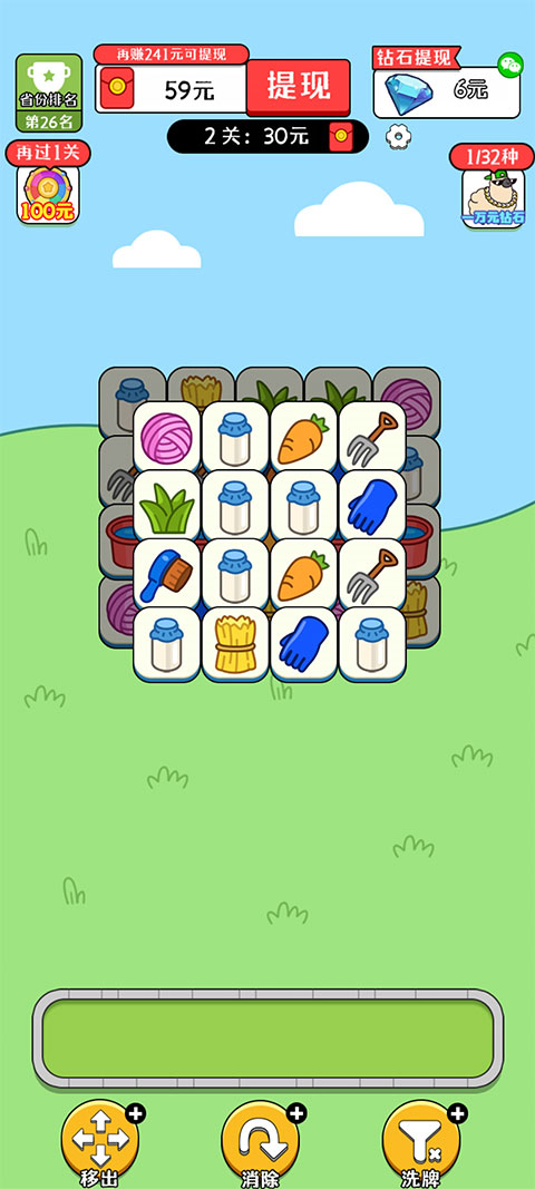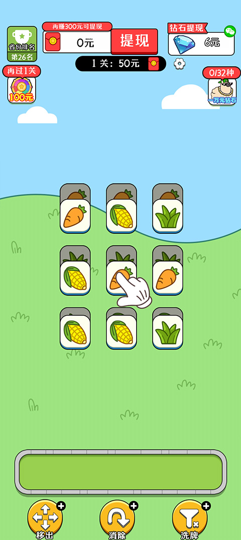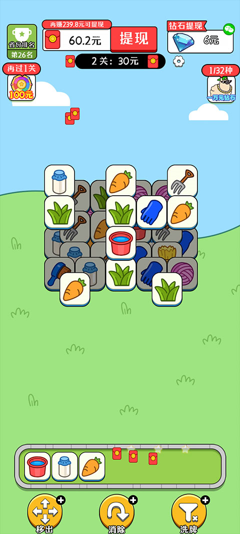 4、每次消除三个,都可以获得红包,上方可以看到目前可以提现的金额。