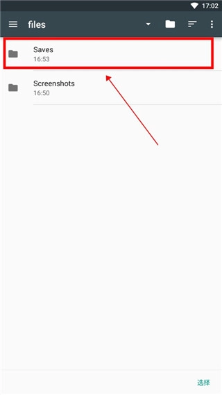 请注意,文件查找操作到这里就可以结束了。进入【Saves】文件夹后,直接点击下方的选择按钮即可。这里显示的文件是我们在第一步创建的游戏存档,无需进入该存档内部操作,因为进入存档后再点击选择是没有效果的。
