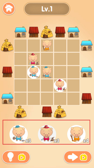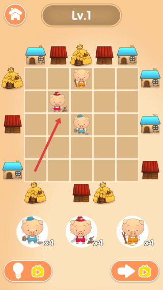 1、启动关卡:点击主界面黄色三角形按钮,进入Lv.1小猪布局关卡。