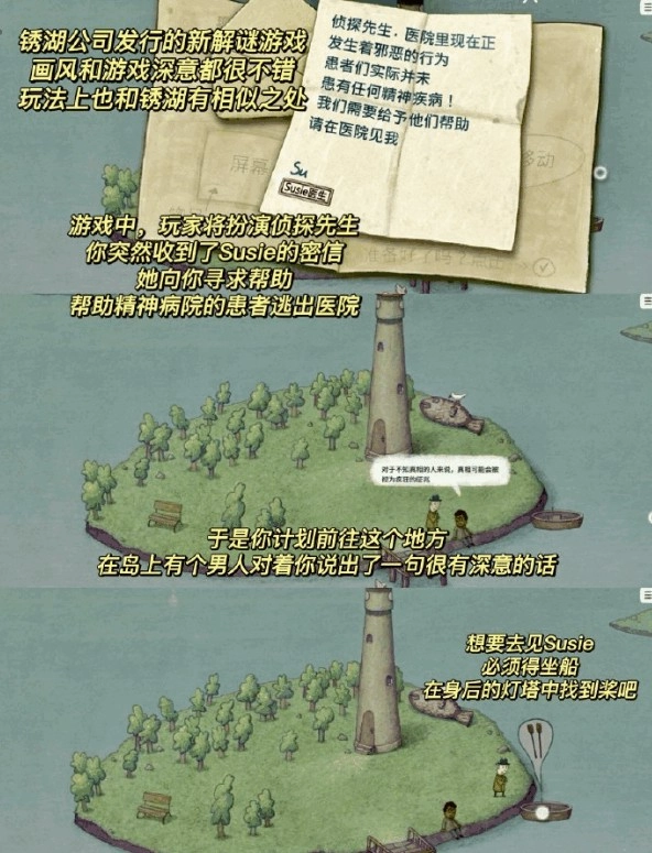 游戏里,玩家要扮演侦探先生。你忽然收到了Susie的密信,她向你求助,希望你能帮助精神病院的患者逃离医院——对那些不知归期的人而言,这或许是能抓住的一线生机。于是你打算前往那个地方。到了岛上,有个男人对你说出一句耐人寻味的话:“想要去见Susie,必须得坐船,去身后的灯塔里找找桨吧。”