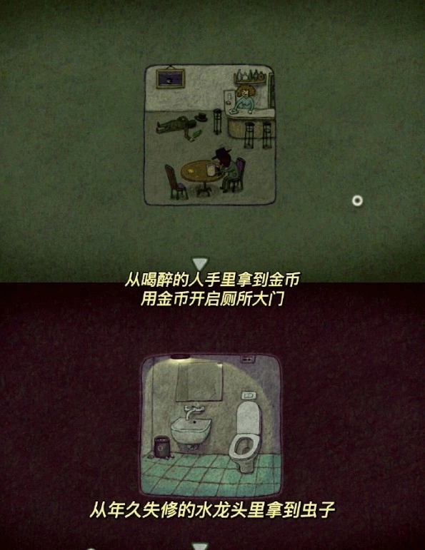 从醉酒之人手中取来金币,用这金币打开厕所的门,再从那老旧损坏的水龙头里捉出虫子。
