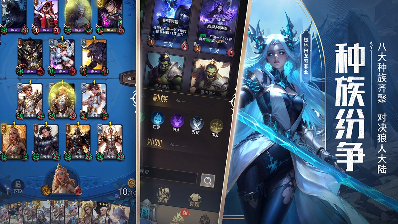 兽人在游戏前期的表现通常比较乏力,核心原因在于前期难以积累足够的血量,容易受到天使的护盾技能以及亡灵阵营的克制。不过进入中期后,一旦搭配上丛林猎手和百夫长这两张关键卡牌,就能实现属性的快速提升。由于兽人阵营中拥有打出效果的卡牌数量较多,和中立卡黄金树人配合时,能触发多倍的增益效果。征兵官这张卡可以帮助玩家在需要特定兽人卡牌时轻松获取,而兽人术士更是能直接召唤出一批兽人卡牌,再搭配大酋长的刷牌机制,整个卡组的运转会非常流畅。至于近期更新的战争领主,尽管它的效果仅持续一回合,但属性增长的幅度确实有些夸张,后续版本可能会对其进行一定程度的调整削弱。