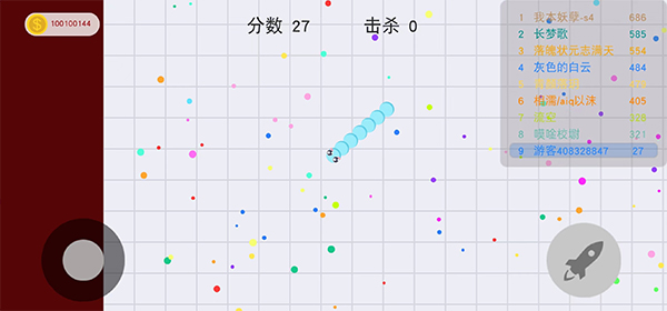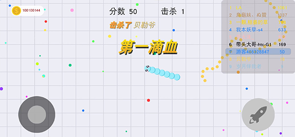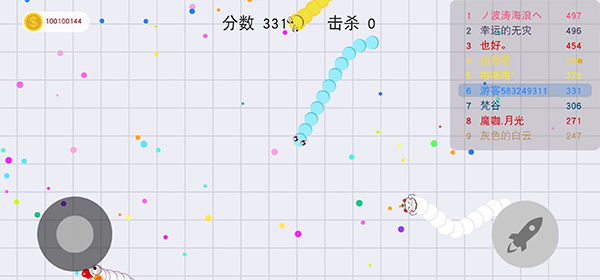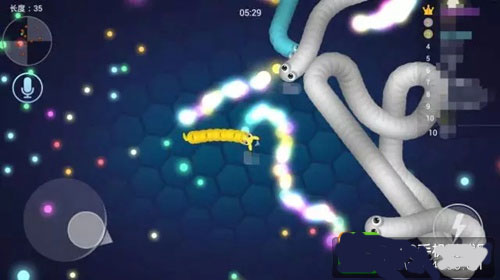 1、控制摇杆走位你的小蛇,吃掉地图上彩色的小圆点,就会变长哦。