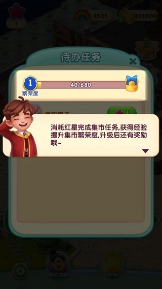 3、挑战成功后,点击“任务”,在这里你将会看到待办任务,完成任务即可获得经验,而且在你收集红星之后可通过消耗红星完成集市任务,获取经验,提升集市繁荣度,升级之后还有丰厚奖励哦~