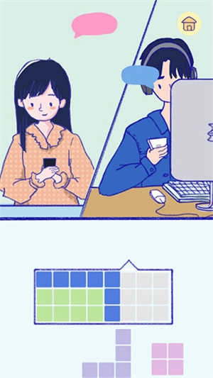 游戏开场时,女主角会在地铁里和妈妈通电话,此时会弹出两个对话选项,玩家只需点击自己想让女主说的内容即可。接下来要帮女主挑选房子,遇到喜欢的房源就点击心形图标,不喜欢的话就点叉号,等进度条填满就完成这部分任务了。当场景切换到客厅沙发处,玩家需要把拼图拼完整,拼好后联系房东会触发一个小游戏,完成这个小游戏,第一章就结束了。总的来说,这一关的难度不算高。