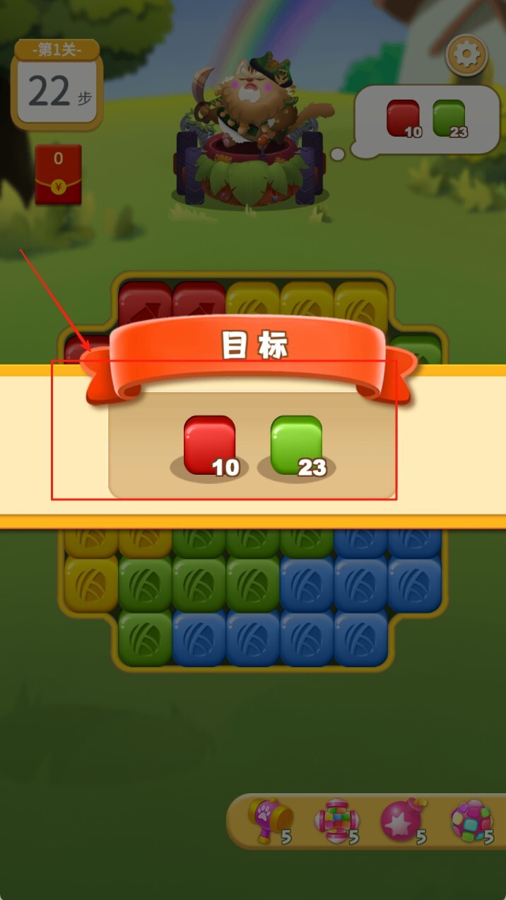 1、第1关需在22步内收集10红23绿方块,左上角步数22红包0,底部有5个道具,中间彩色方块区等待消除。