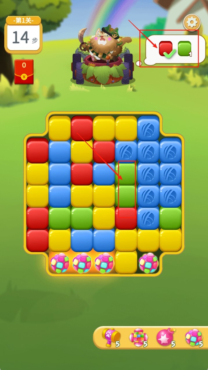 3、第1关剩余14步,红包0,角色坐在宝座上,下方多彩方块阵中有绿色竖列,底部5个道具各5次。
