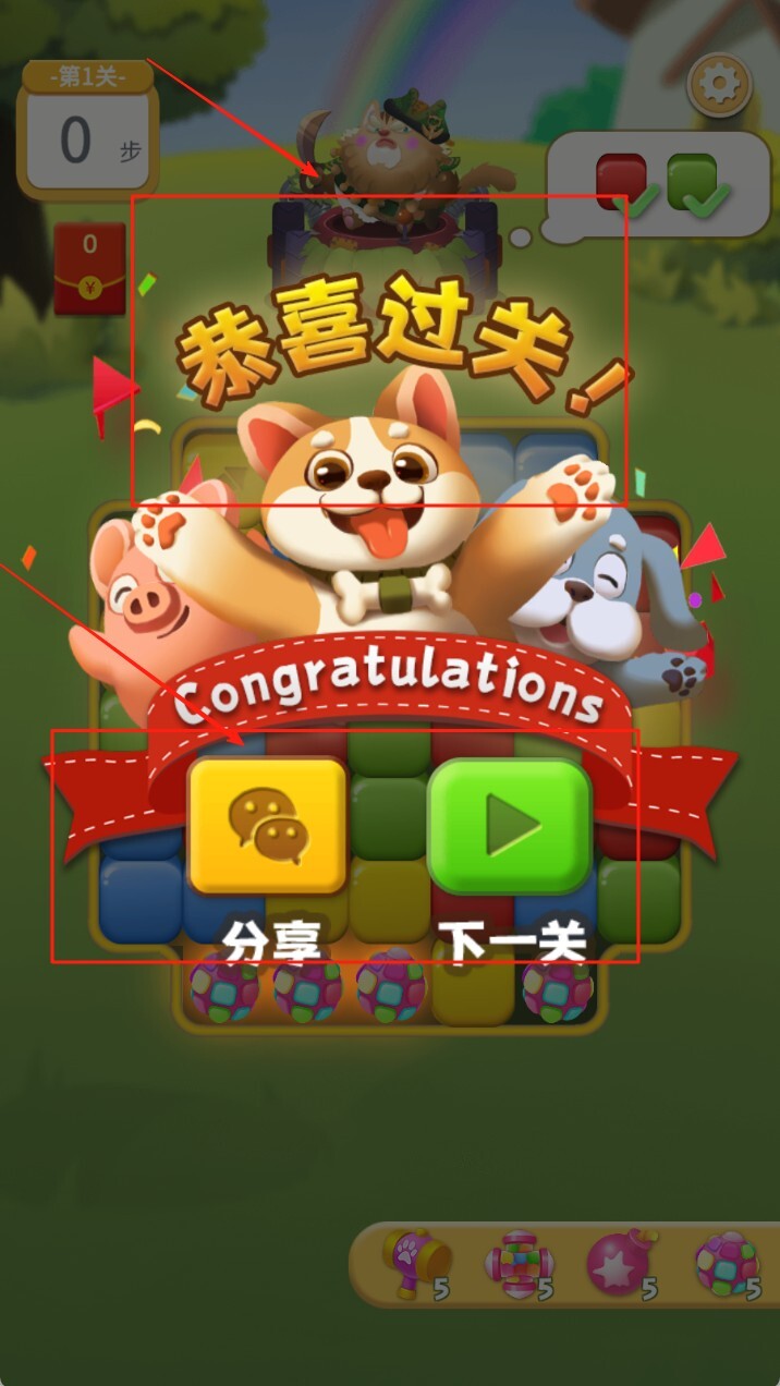 4、过关界面显示恭喜和英文,三只动物庆祝,分享按钮黄色下一关绿色,左上第1关0步,道具各剩5个。
