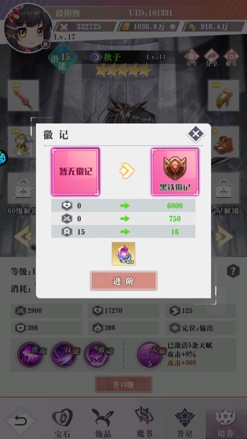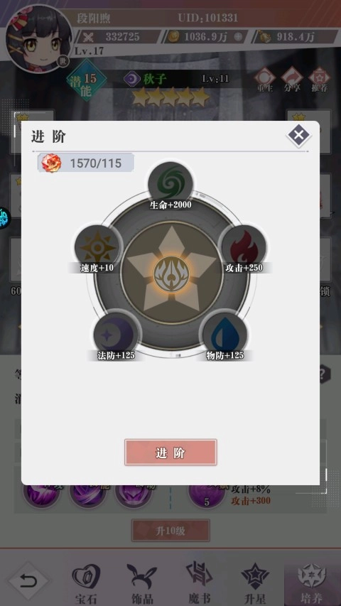 5、英雄培养到满级后可以使用进阶晶石来进阶,可以提升等级上限,增加战力。