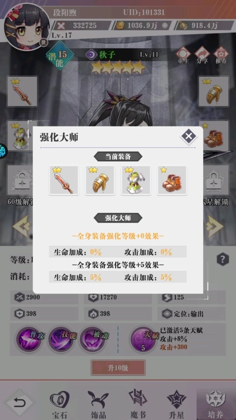 强化装备同样能提升属性,建议对全身装备进行强化,这样可以激活全身强化的额外效果。