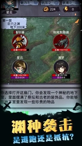 PS1:血量下方显示的是压力值,每次进行行动都会降低压力值,当压力值归零时角色会进入诅咒状态,处于该状态下每次行动都会大幅损失生命值,同时还会遭遇更多的怪物。