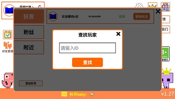 然后点击左侧的好友管理选项,接着选择添加好友功能,输入好友的ID进行查找,找到后点击关注按钮。