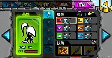 游戏里能升级的不只有士兵,英雄同样可以升级。在游戏开始前,我们点击英雄头像,选择英雄选项后,就能根据自己的需求来升级英雄的各项属性了。这里提醒大家,升级英雄不需要花费金钱,但会消耗SP值,所以一定要仔细考虑,选择对自己最有用的属性来升级哦。