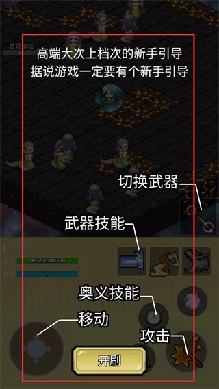 在新手引导环节,要先熟悉【移动】和【攻击】按钮的操作,接着掌握【切换武器】的方法以及技能的使用技巧,最后点击【开刷】按钮就能开启战斗啦。