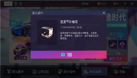 速度节补给箱的单次抽取价格为100礼品卡,十连抽取价格为970礼品卡,每日限购100次;可以开出整车、改装芯片、万能零件及金币奖励。