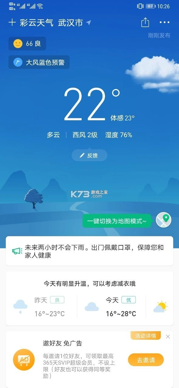 彩云天气是一款专注于提供精准气象预报的应用。它采用先进的数据分析技术,为用户展示详细的天气信息。该应用不仅可以预测未来几天的天气趋势,还会实时更新,让用户及时了解最新的天气动态。其界面设计简洁明了,用户能快速查看气温、降水概率、风速等重要气象数据。此外,应用还提供穿衣指数、紫外线指数等生活建议,帮助用户更好地规划日常行程。