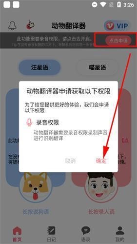 2、在人语框中长按即可录取声音,松开后则会自动翻译成“瞄星语”或“汪星语”,并且自动播放出来,相反的,录制狗狗或猫猫的录音也可将意思翻译成中文。