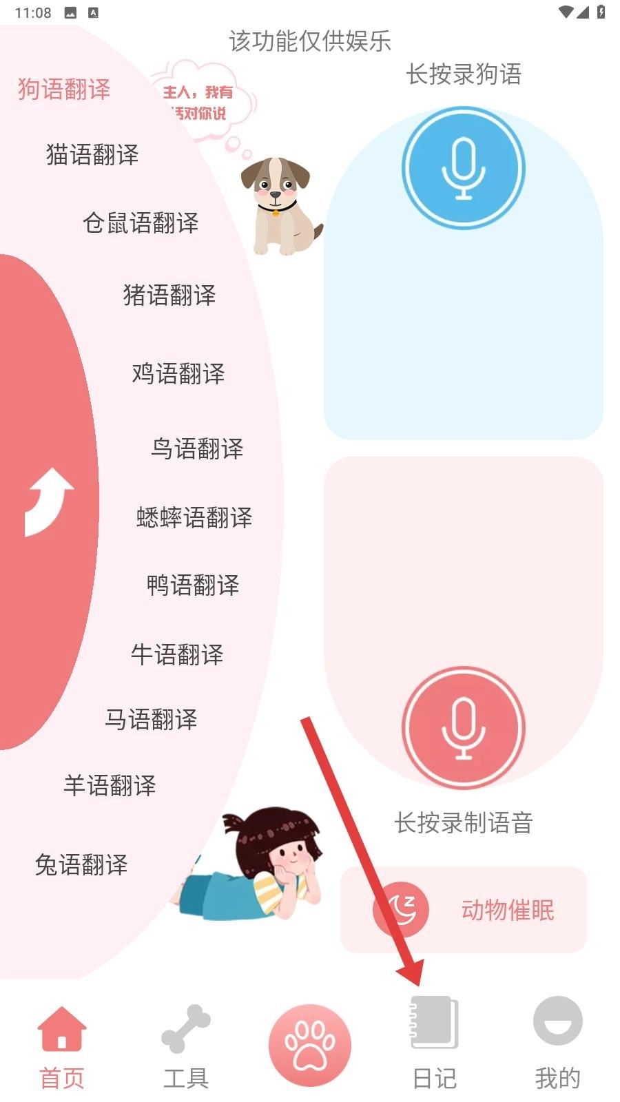 3、除了录音翻译外,软件还支持便捷式语音,如下图所示,我们点击“语录”即可进入选择常用狗狗和猫猫的语音。