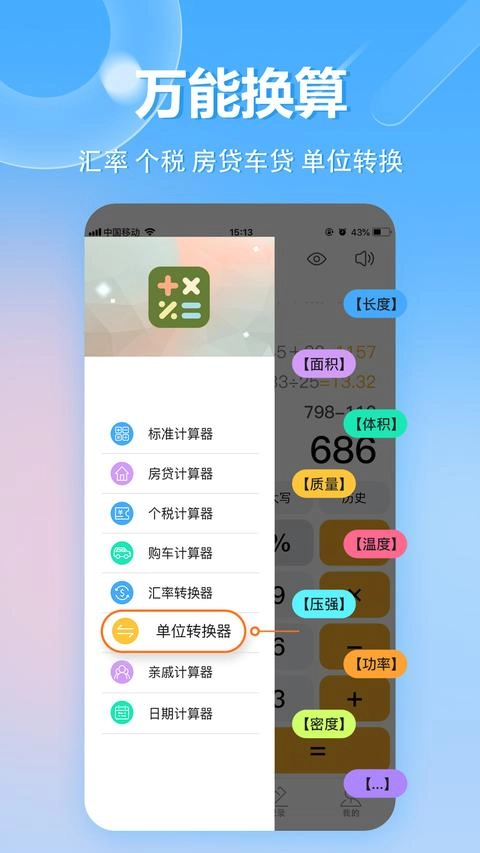 科学计算器是一款集成了多种计算器功能的软件,无论是日常计算还是数学难题,都能通过它轻松解决。此外,软件还了丰富的换算功能,支持各类单位之间的转换,为用户的工作和学习提供便捷,让操作更加轻松高效!