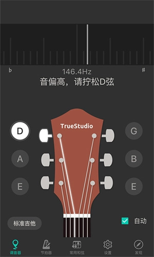 1、打开软件,默认是自动吉他调音,拨动琴弦软件会显示对应的弦和音准,不断调整使标尺位于中间并全绿通过就表示调准了;
