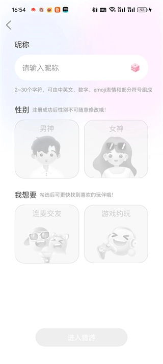 3、最后来到设置个人信息的页面,我们输入昵称,选择性别后点击【进入猎游】;