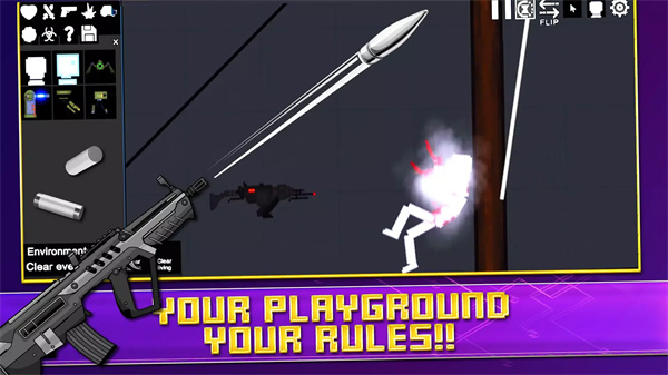 使用丰富多样的武器、载具和工具与场景互动,观察人物模型在各种冲击下的滑稽反应与物理效果。
