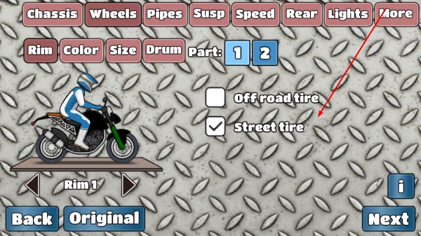 在【Wheels】界面选择【Streettire】,这样可以为后续的摩托车改装环节做好准备。