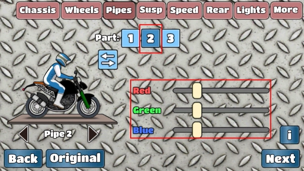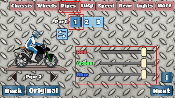 进入【Pipes】界面并选择【Part1】,利用红-绿-蓝滑块调整颜色,以适配摩托车的外观需求。