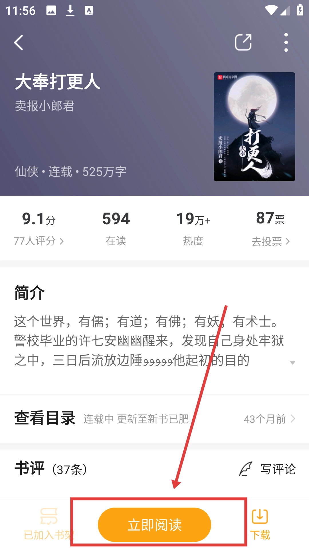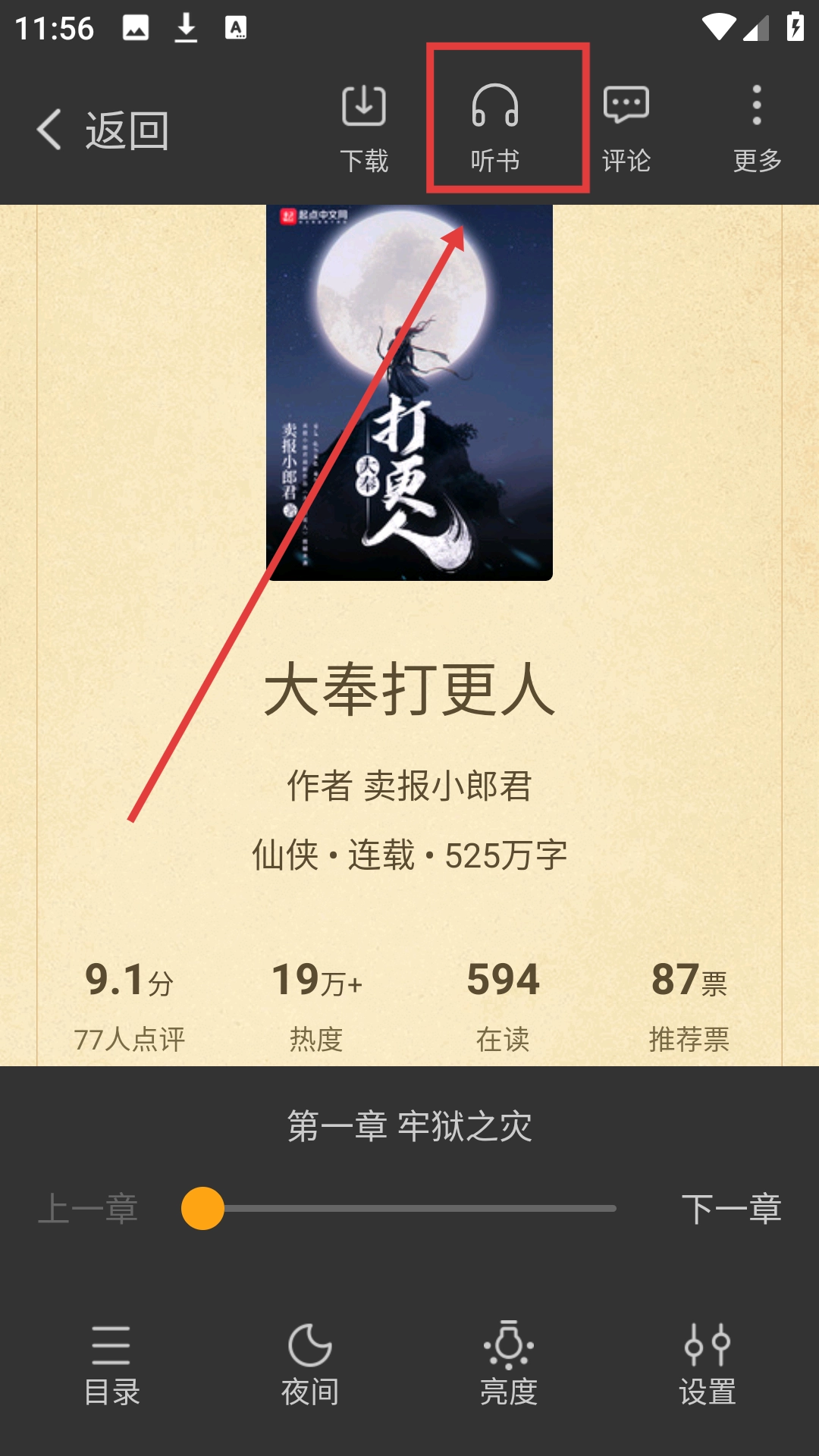 在《大奉打更人》的详情页面,点击【立即阅读】按钮,就能进入阅读界面,马上可以开启听书功能了。