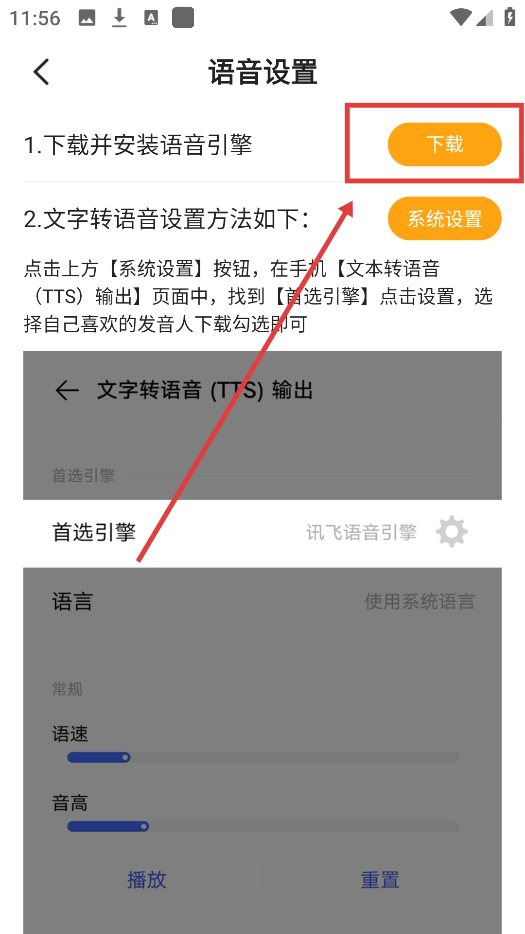 在语音设置页面,点击【】,即可下载并安装语音引擎,完成听书功能的准备工作哦。