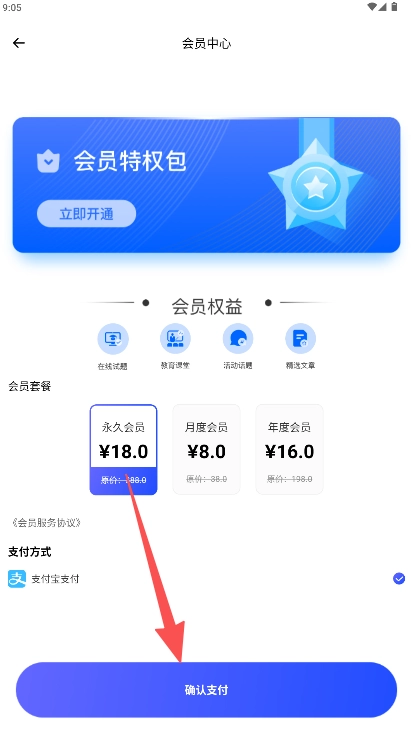 在会员中心选择套餐并点击底部“确认支付”按钮。