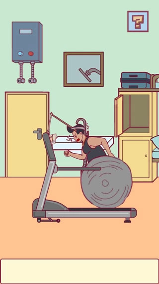 首先在右侧垃圾桶中找到一张纸,点击跑步机让其运动,在用纸临摹小伙想象中的美女,然后在小伙右侧上方的箱子中获得一个三脚架,并让其架在跑步机中,最后将图片固定在三脚架中点击跑步机就可以燃烧卡路里了。